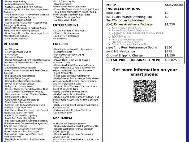 Driver Assistance Package: Active Speed Limit Assist; Route-Based Speed Adaptation; DISTRONIC Plus with Steering Assist and Stop and Go Assist; PRE-SAFE PLUS; Active Lane Change Assist; PRE-SAFE Impulse Side; Driver Assistance Package Plus MB Navigation AMG Real Performance Sound **Equipment listed is based on original vehicle build and subject to change. Please confirm the accuracy of the included equipment by calling the dealer prior to purchase.**